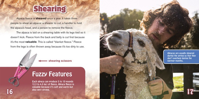 For hundreds of years, the people of South America have bred alpacas for their soft and durable fiber. Readers will explore the relationship between farmers and domesticated alpacas, and learn about the processes of shearing and preparation that transform raw alpaca fiber into textiles. With colorful photographs and lively language, this book explores curricular subject matter in an entertaining way.