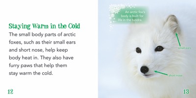 Arctic foxes have developed special adaptations that help them survive in the unwelcoming tundra. In the winter, their fur is white; in the summer, when the snow melts, they grow gray or brown fur. The furry bottoms of their feet and their large tails keep them warm all year round. Readers will enjoy discovering these and other facts about this marvelous animal. These facts enhance readers? understanding of common science curriculum topics. Stunning photographs enhance the accessible text in a way that is sure to captivate young readers.