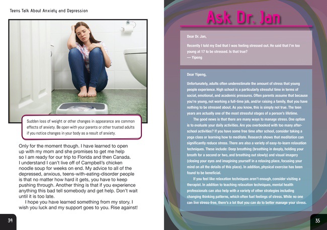 In real teens' voices, this engaging book offers comfort and advice for young people dealing with their own mental health issues or those of a loved one. A compilation of true stories by young adults facing the challenges of anxiety and depression, the book features compelling first-person accounts of panic attacks, suicidal depression, and self-harm, among other topics. Each contributor brings a unique perspective to the discussion of mental illness, and the relatable tone helps readers connect with an issue of great relevance to their own lives.