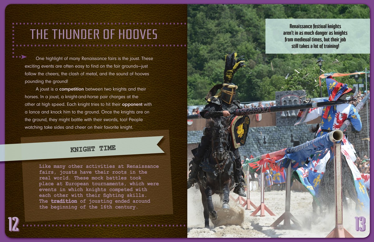 Did you know that you can travel through time? You don't need a time machine or magical powers; you just need to visit a Renaissance fair. This book will introduce young readers to the wonderful world of Renaissance fairs and festivals, providing an age-appropriate peek into the history and background of these imaginative events. Through colorful photographs and intriguing graphics, readers will be immersed in these events, learning about exciting festival features such as jousting, music, characters, and artisans. They'll learn about how they can step into the history and magic themselves.