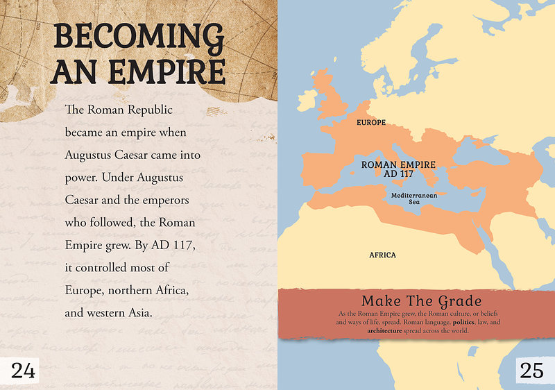 All roads lead to Rome. Or they did. What had started as a small town on the Tiber River in central Italy would eventually grow to become a vast empire covering most of the known world, including England, western Europe, northern Africa, and western Asia. Although the Roman Empire fell in the 5th century, many of its accomplishments live on in our modern world. Readers will learn about the advancements Rome made in politics, architecture, law, and the arts. Accessible text is paired with full-color photographs, maps, and biographies of important historical figures.