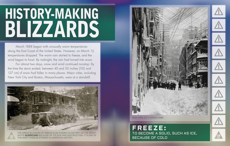 Blizzards bring blinding snow, major wind gusts, and treacherous ice to many parts of the world. All of these create dangerous challenges and demonstrate nature's power. This book introduces readers to the conditions that cause blizzards to form and will familiarize students with the most extreme blizzards in history. Safety and survival techniques are explained. With striking photographs of record snowfalls and engaging facts about the incredible destruction blizzards cause, this book will captivate readers as they explore Earth science curricula content.