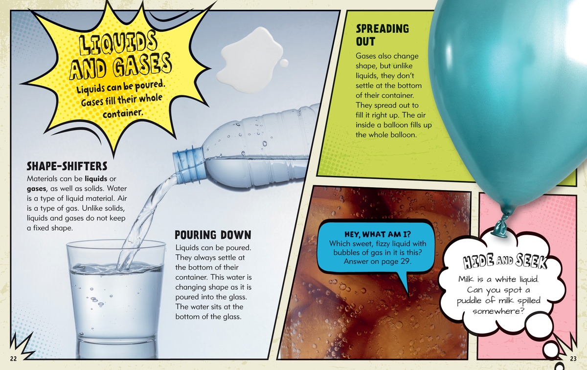 So many materials make up our world, such as wood, glass, metal, plastic, and water. They are each composed of different kinds of matter. Engaging curricular science meets a colorful comic-book design in this cool take on the science of materials. Readers will learn how substances combine to make familiar objects and how our world would be much different without them. Fun facts, puzzles, experiments, and quiz questions will keep young scientists motivated to investigate the matter of the objects in their lives.