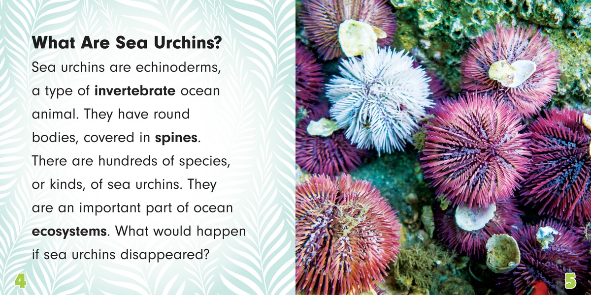 From the fiercest predator to the lowliest plant, every member of an ecosystem is immeasurably important to the survival of their environment. Although they're not regarded as a keystone species, sea urchins play a pivotal role in maintaining healthy marine environments. Without sea urchins to consume algae, entire coral reef ecosystems could collapse. This educational text invites readers to imagine a world without sea urchins, delving into curricular science concepts, such as interdependence of species, with accessible language and real-world examples.